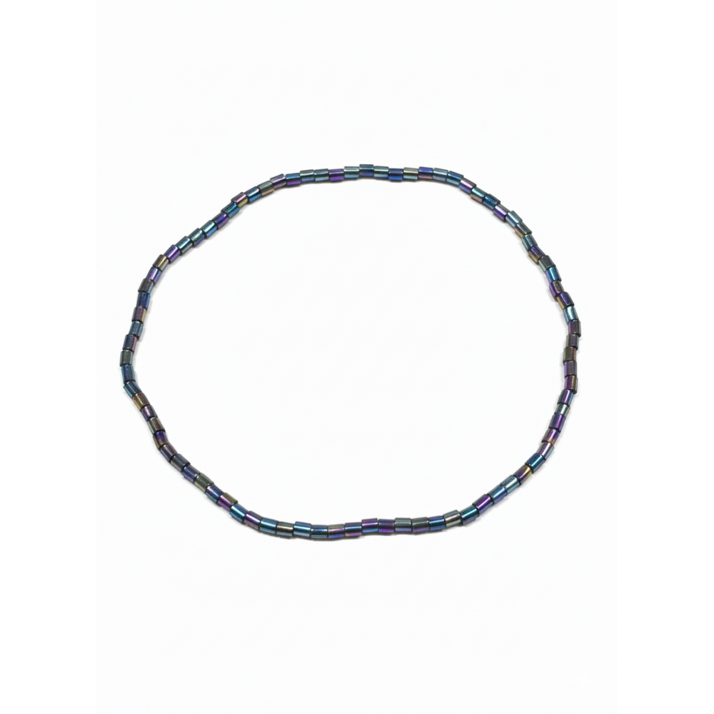 This Iridescent Oil Slick Tube Bead Bracelet is a captivating minimalist accessory that offers a modern, edgy twist on the classic beaded strand. The design features a continuous row of small, uniform cylinder-shaped beads finished with a stunning multi-chrome "oil slick" coating. This unique iridescent effect allows the bracelet to shift beautifully between deep shades of metallic purple, teal, and charcoal as it catches the light. Its slim, low-profile silhouette makes it an ideal choice for a subtle solo statement or as a bold addition to a layered bracelet stack. Engineered for daily comfort, the beads are strung on a high-tensile elastic stretch cord, providing a secure, clasp-free fit that easily accommodates most wrist sizes.