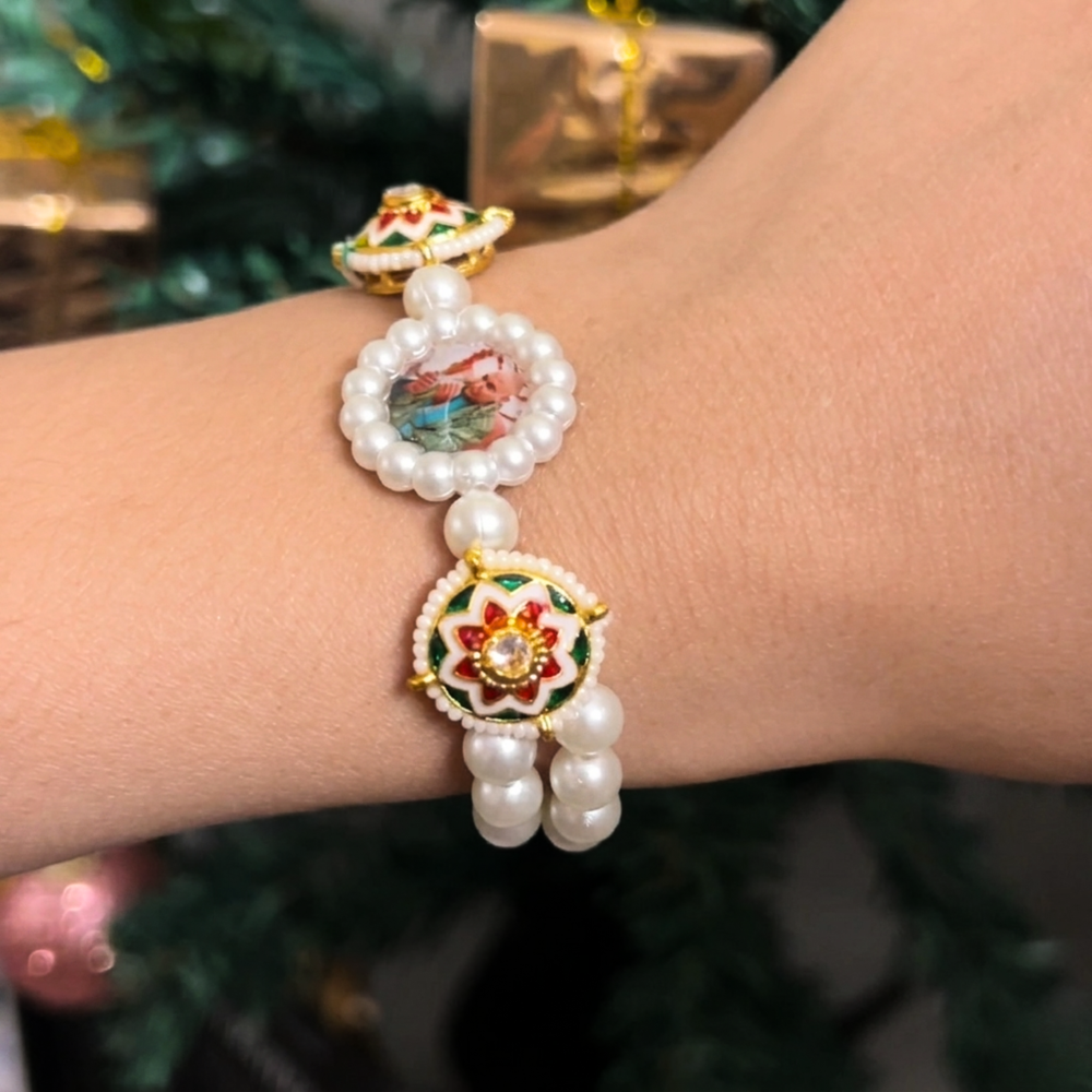 Double-Row Pearl Band: A classic design element, the bracelet is structured with two parallel rows of high-luster faux pearls, providing a richer, 'Kada-style' look.