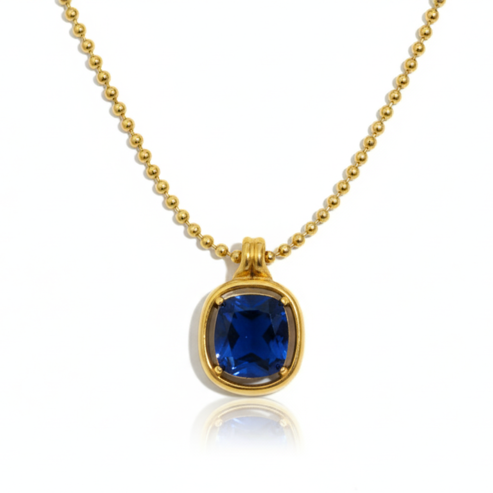 Radiant Cushion-Cut Gemstone: The necklace features a large, cushion-cut crystal in a stunning sapphire blue, offering brilliant light reflection and a deep, regal saturation.