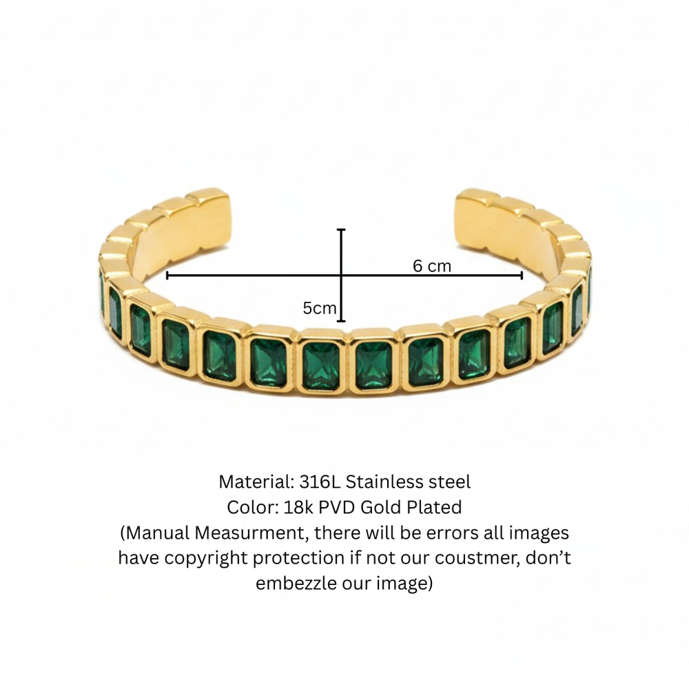 Make a bold statement with this Emerald-Cut Green Crystal Open Cuff Bangle, a piece that effortlessly combines architectural precision with a rich, regal color palette. Featuring a continuous row of vibrant gemstones, this structured cuff is designed for those who appreciate modern geometry and high-end elegance.