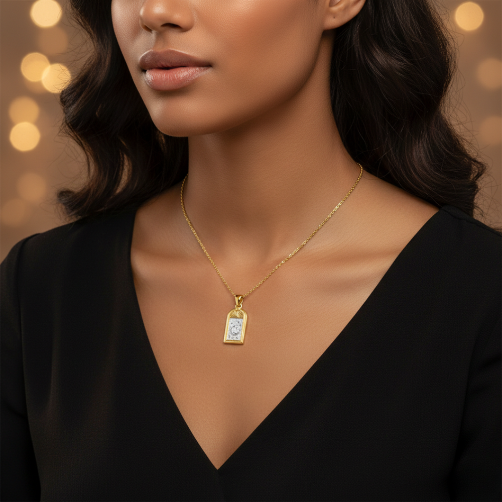 Exquisite Two-Tone Detail: The pendant features a high-polish gold-finished frame contrasted against a textured silver-toned sky, emphasizing the brilliance of the crescent moon and stars.