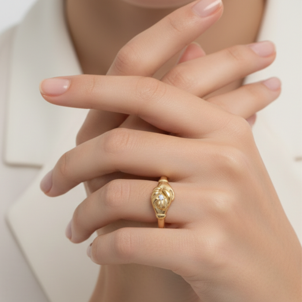 Symbolic Hand Motif: The ring features a detailed centerpiece of two hands meeting in a clasping or holding gesture, offering a tactile and artistic aesthetic.