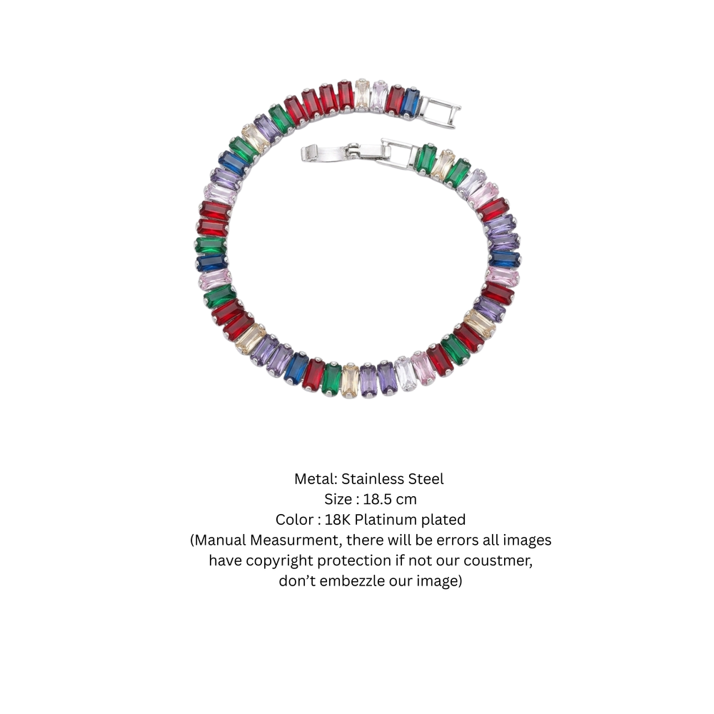 Elevate your jewelry collection with this vibrant and sophisticated Multi-Color Baguette Tennis Bracelet. Featuring a stunning array of precision-cut crystals in a spectrum of bold jewel tones—including ruby red, emerald green, sapphire blue, and soft amethyst—this piece is designed to capture and reflect light from every angle.