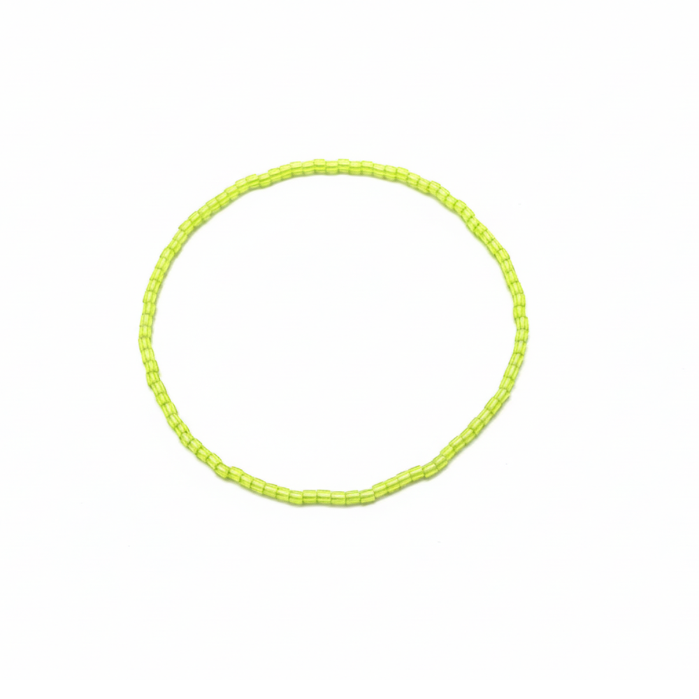 This Vibrant Lime Green Glass Seed Bead Bracelet is the perfect minimalist accessory for those who love a bold pop of color. Each piece is meticulously crafted with a continuous strand of uniform, small-scale seed beads in a bright, electric green finish that stands out whether worn alone or layered. Its ultra-dainty, low-profile design makes it a versatile foundational piece for jewelry stacking, easily pairing with watches or other colorful strands. Designed for maximum comfort and durability, the bracelet features a high-quality elastic stretch cord that provides a secure, clasp-free fit for effortless daily wear.