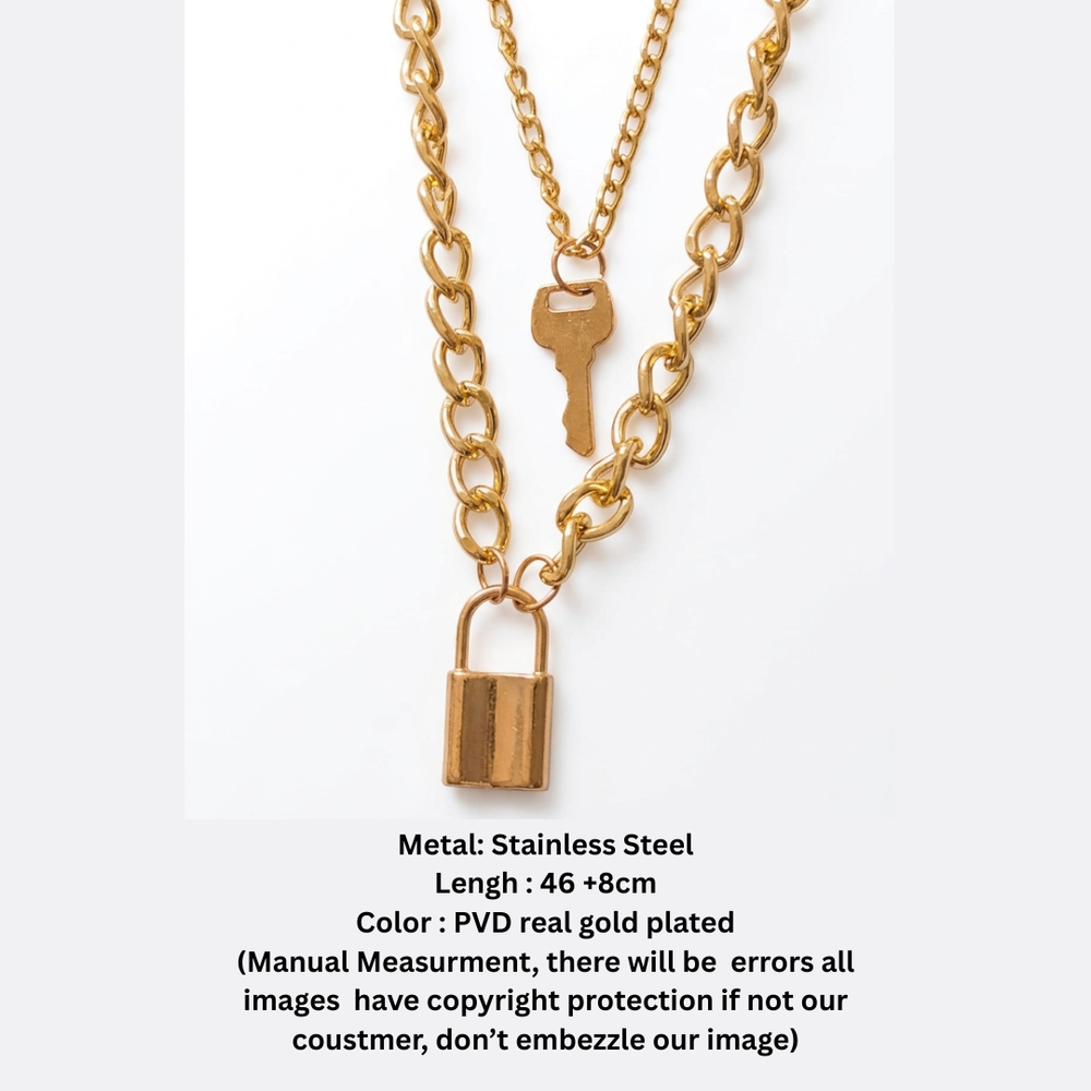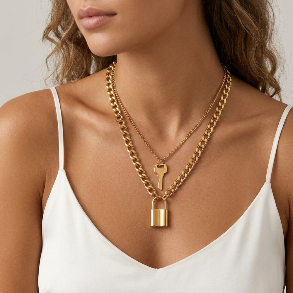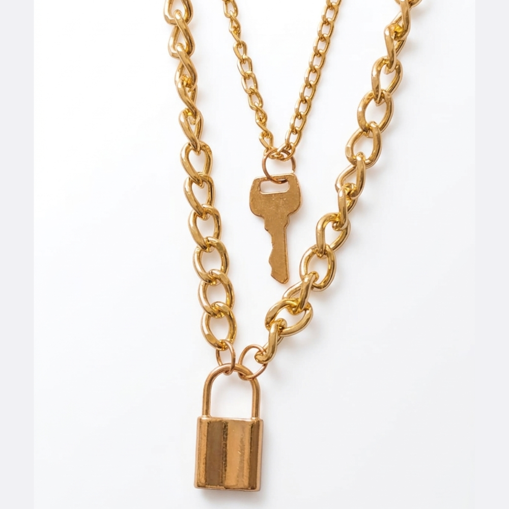 The piece features a shorter, classic link chain with a perfectly detailed, functioning key pendant. Hanging beneath it on a bolder, chunkier curb-link chain is a sleek, classic padlock—creating a multi-dimensional, stacked look.